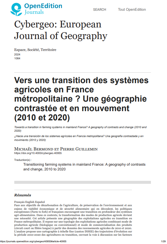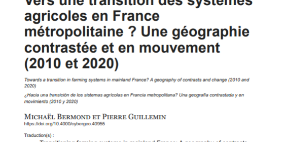 On March 21, 2024, the PLAT4TERFOOD project published an article titled “Towards a transition in farming systems in mainland France? A geography of contrasts and change (2010 and 2020)” in the journal Cybergeo: European Journal of Geography.